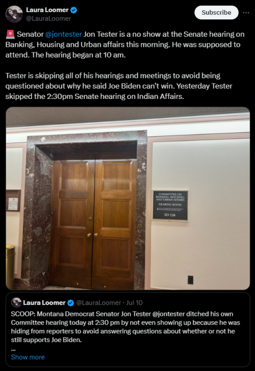 Laura Loomer - Jul 12th 2024 9:13am EDT Montana United States Senator Jon Tester experienced a historically horrific week in Washington. Tester spent his week hiding from the press to avoid questions about Joe Biden’s cognitive decline. Tester’s hiding resulted in him skipping his United States Senate committee assignments on Wednesday and Thursday. If Tester is too afraid to show up to work […]
