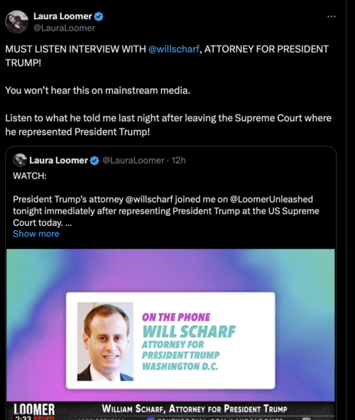 Laura Loomer - Apr 26th 2024 1:00pm EDT Will Scharf, President Trump’s attorney and candidate for Missouri Attorney General, joined Loomer Unleashed on Thursday for an exclusive interview discussing the political weaponization against President Trump. Scharf broke the groundbreaking news that Micahel Dreeben, the individual who Jack Smith chose to deliver Thursday’s oral arguments to the United States Supreme Court in the case involving President Trump’s presidential […]