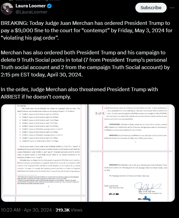 Conflicted Judge Merchan Fines President Trump For “Violating” Gag Order That Cancelled Trump’s 1st Amendment Rights”