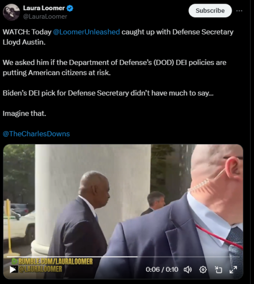 Laura Loomer - Apr 30th 2024 5:56pm EDT United States Secretary of Defense Lloyd Austin refused to answer Loomer Unleashed when we asked him if the Department of Defense DEI-focused policies put Americans’ safety at risk. Austin avoided our questioning as he entered Capitol Hill for a hearing on Tuesday. According to the Pentagon’s “Department of Defense Equity Action Plan 2023 Update,” the […]