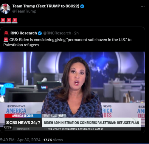 American Renaissance - May 1st 2024 7:47pm EDTThe Biden administration is considering bringing certain Palestinians to the U.S. as refugees, a move that would offer a permanent safe haven to some of those fleeing war-torn Gaza, according to internal federal government documents obtained by CBS News. In recent weeks, the documents show, senior officials across several federal U.S. agencies have discussed the practicality […]