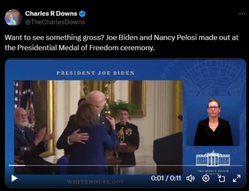 Laura Loomer - May 3rd 2024 6:22pm EDT Friday afternoon was one big “Get Trump” party at the White House as Joe Biden awarded Nancy Pelosi the Presidential Medal of Freedom. Biden thanked Pelosi for “standing up for democracy” on January 6th. After giving her the award, Pelosi and Biden kissed each other on the lips. Pelosi was the key figure in both […]