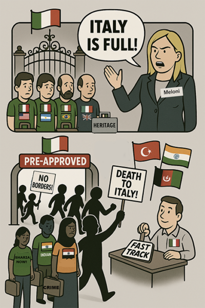 American Renaissance - Apr 8th 2025 6:34pm EDT In 2022, Giorgia Meloni swept into power promising to defend Italy’s people, cultural identity, and borders. Millions of Italians worldwide saw her as a savior — someone finally committed to putting Italy first after decades of unchecked migration and political cowardice. But as time passes, the mask is slipping. I am among the millions with […]