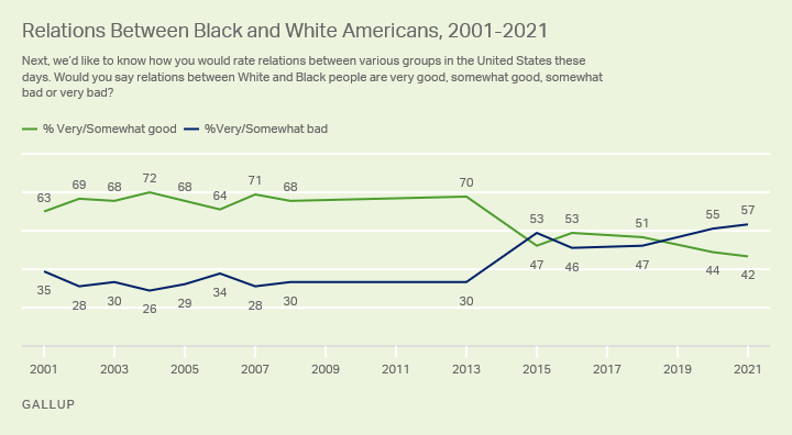 Occidental Dissent - Jul 22nd 2021 12:23pm EDT This isn’t surprising. After the Great Awokening, the George Floyd riots and the rollout of systematic racism by the Biden administration, black-white race relations have fallen to a new low. Gallup: “WASHINGTON, D.C. — For the second consecutive year, U.S. adults’ positive ratings of relations between Black and White Americans are at their lowest point […]