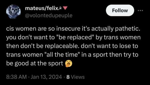 Daily Stormer - Jan 15th 2024 5:00am EST Biofront holes are some of the most cowardly and hateful people on the planet. The science has shown that a trans woman has zero advantage over a woman with a biological front hole, in sports or anywhere else. The only reason you would refuse to play against brave trans individuals is that you are drive […]
