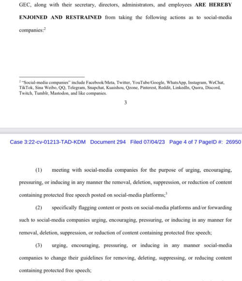 Earlier today, federal Judge Terry Doughty of the Western District of Louisiana issued a preliminary injunction barring the White House and several federal agencies from trying to get social media companies from censoring people or posts. If the post is “protected free speech,” the agencies CANNOT ask Twitter, Facebook, or anyone else to do anything […]
