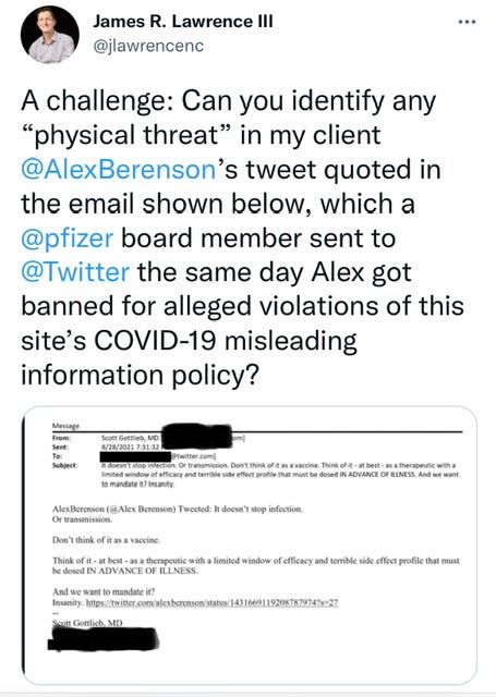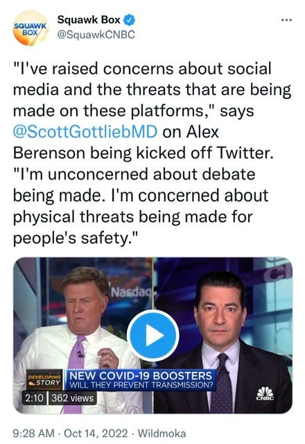 Alex Berenson - Oct 14th 2022 12:22pm EDT This morning, CNBC anchor Joe Kernan asked Dr. Scott Gottlieb about my Substack last night showing he had asked Twitter to censor me last August, just before it did. Gottlieb, who is a CNBC contributor, the former head of the Food and Drug Administration, and a Pfizer board member could have said almost anything in […]