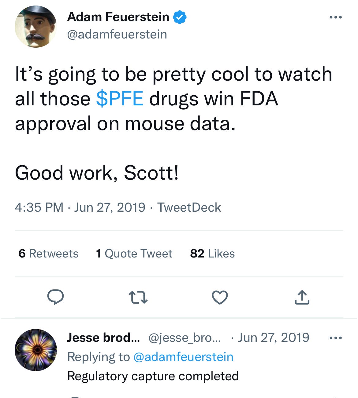Alex Berenson - Oct 22nd 2022 7:49am EDT Before Covid hysteria and hatred for Donald Trump broke his brain, Adam Feuerstein was a pretty good reporter. Feuerstein has covered Big Pharma for many years, since 2017 for an pharmaceutical and healthcare-focused Website called STAT. Among biotechnology investors, he’s widely read and sometimes feared. He has a long memory for the hyperbole (if not […]
