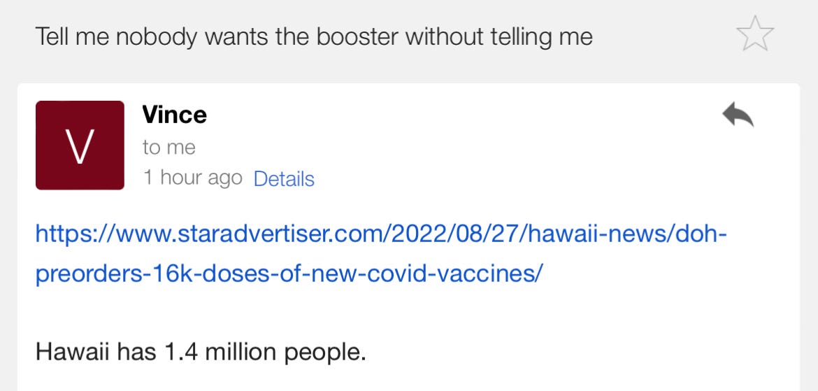 Alex Berenson - Aug 27th 2022 6:51pm EDT My man Vince speaks the truth. If the mRNA shots are dead in Hawaii, they’re dead everywhere (maybe dead is the wrong word given the all-cause mortality numbers we’re seeing): — Added bonus: the shots are “anticipated to be available” even though the Food & Drug Administration hasn’t even approved them yet and – as […]