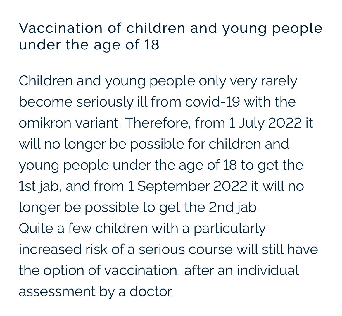 Alex Berenson - Aug 9th 2022 1:34pm EDT This announcement is both a statement of the reality that healthy kids are at essentially zero risk from Covid and a vote of no confidence in the long-term risk-benefit profile of the mRNA jabs: American vaccine fanatics, take note. You are hurting your kids for no reason except your own narcissism and anxiety. Powered by […]