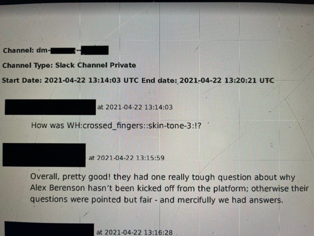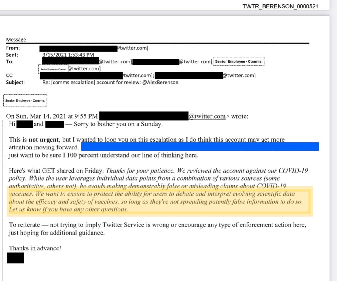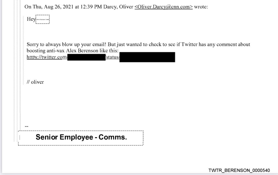 Alex Berenson - Aug 23rd 2022 11:53am EDT The gold mine that is Berenson v. Twitter keeps spitting nuggets: It wasn’t just the White House that was after me last year… my fellow members of the Fourth Estate were in touch with Twitter too. (It appears that at some point, Twitter’s Trust & Safety Team turned into the Dealing With Angry Karens Unit, […]