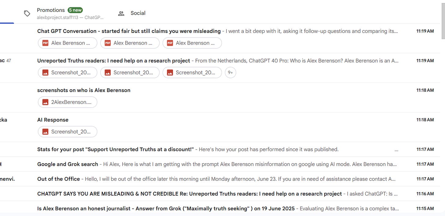 Alex Berenson - Jun 19th 2025 11:39am EDT Talk about blowing up my inbox… Not even an hour ago, I asked you to see what the AI engines are saying about me. Here’s what my inbox looks like now: — Whew. I expected my inbox would blow up, but not THIS fast. Thank you all! And if you missed the email an hour […]