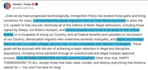 American Renaissance - Dec 4th 2025 5:41pm EST This video is available on Rumble, Bitchute, Odysee, Telegram, and X. On Thanksgiving Day, after an Afghan opened fire on National Guardsmen in Washington, Donald Trump unleashed a mighty blast against immigrants that ended with these words: “I will permanently pause migration from all Third World Countries . . . and remove anyone who is […]