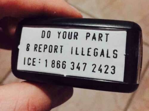 People are using these little hand-stampers to remind America that its immigration crisis can be resolved by reporting suspected illegal aliens to Immigration and Customs Enforcement. You can get a three-line stamper for about $10 and give it the custom message: DO YOUR PART & REPORT ILLEGALS ICE: 1 866 347 2423