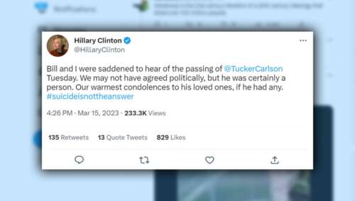 CHAPPAQUA, NY — Hillary Clinton, who famously shattered the glass ceiling for all of womankind, took to Twitter Wednesday morning with a touching tweet for Fox News on-air personality Tucker Carlson in which she expressed her condolences for his upcoming suicide.