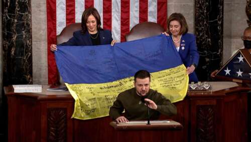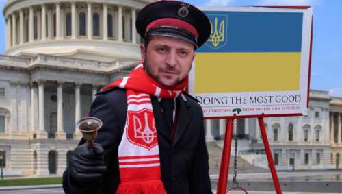 WASHINGTON, DC — Only a day after his address to Congress, Ukraine President Volodymyr Zelensky was seen ringing a bell next to a red donation bucket while standing outside the entrance to the U.S. Capitol building. Sources say it’s yet another attempt to seek money for his nation’s war effort against Russia.