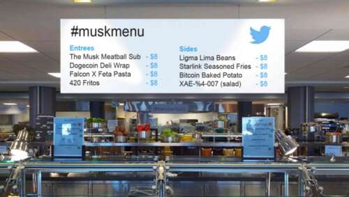 SAN FRANCISCO, CA — Twitter CEO Elon Musk announced Wednesday he would be opening an exclusive company cafeteria that would sell items for $8.00 each, reversing an earlier policy in which free delicacies were lovingly spooned directly into the mouths of employees by an on-call wait staff.