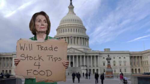 WASHINGTON, D.C. — Since her involuntary retirement from her lucrative gig as Speaker of the House, Nancy Pelosi has been seen lingering on the street corners of the National Mall with a cardboard sign that says “Will trade stock tips 4 food.”