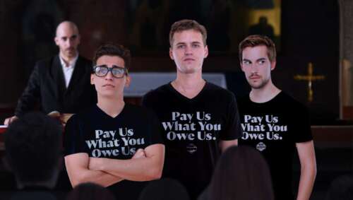 WHITTIER, CA — Members of a local church were caught off guard last weekend after they arrived for Sunday morning service to find a mob of area youth pastors had shown up wearing “Pay Us What You Owe Us” t-shirts.