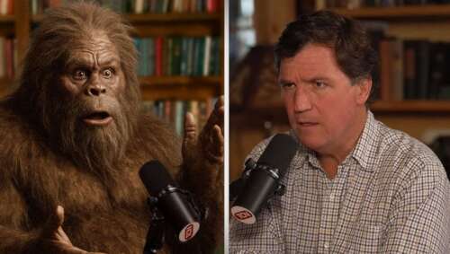 WOODSTOCK, ME — Political commentator Tucker Carlson sparked controversy this week when he welcomed Bigfoot onto his show to discuss how mind-controlling chemtrails are sprayed over the flat earth by the Jews.