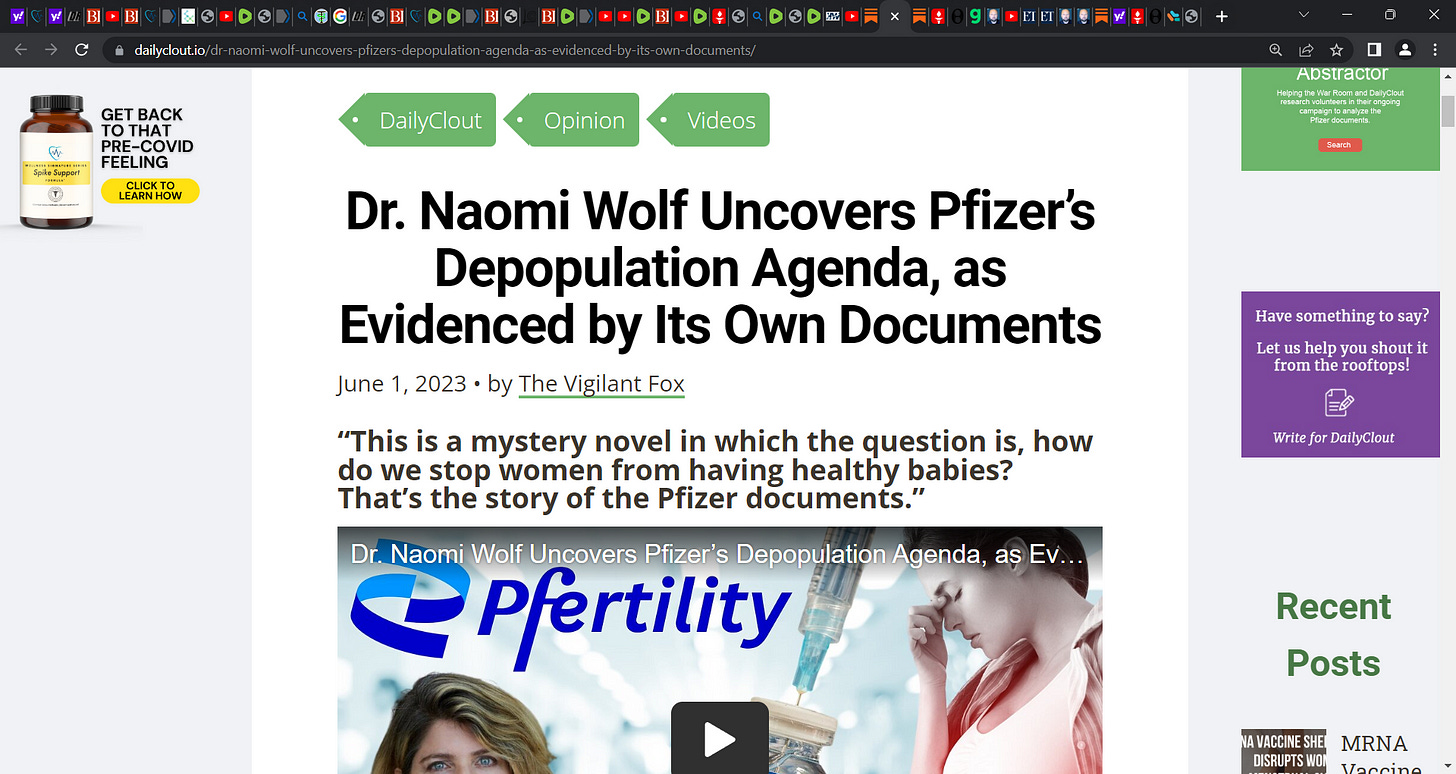 Daily Clout by Dr. Naomi Wolf - Jun 9th 2023 10:27am EDT Originally published on the author’s Substack Wolf and her DailyClout team are on the money and over the target & we thank her for her dominating high-quality scholarship! Relentless to help women and children; God bless Naomi & her team SOURCE: https://rumble.com/v2ra8xs-whats-in-the-pfizer-documents-w-dr.-naomi-wolf.html Follow Dr. Wolf at: https://dailyclout.io/dr-naomi-wolf-uncovers-pfizers-depopulation-agenda-as-evidenced-by-its-own-documents/ ‘“These people [powers that be] don’t want us […]
