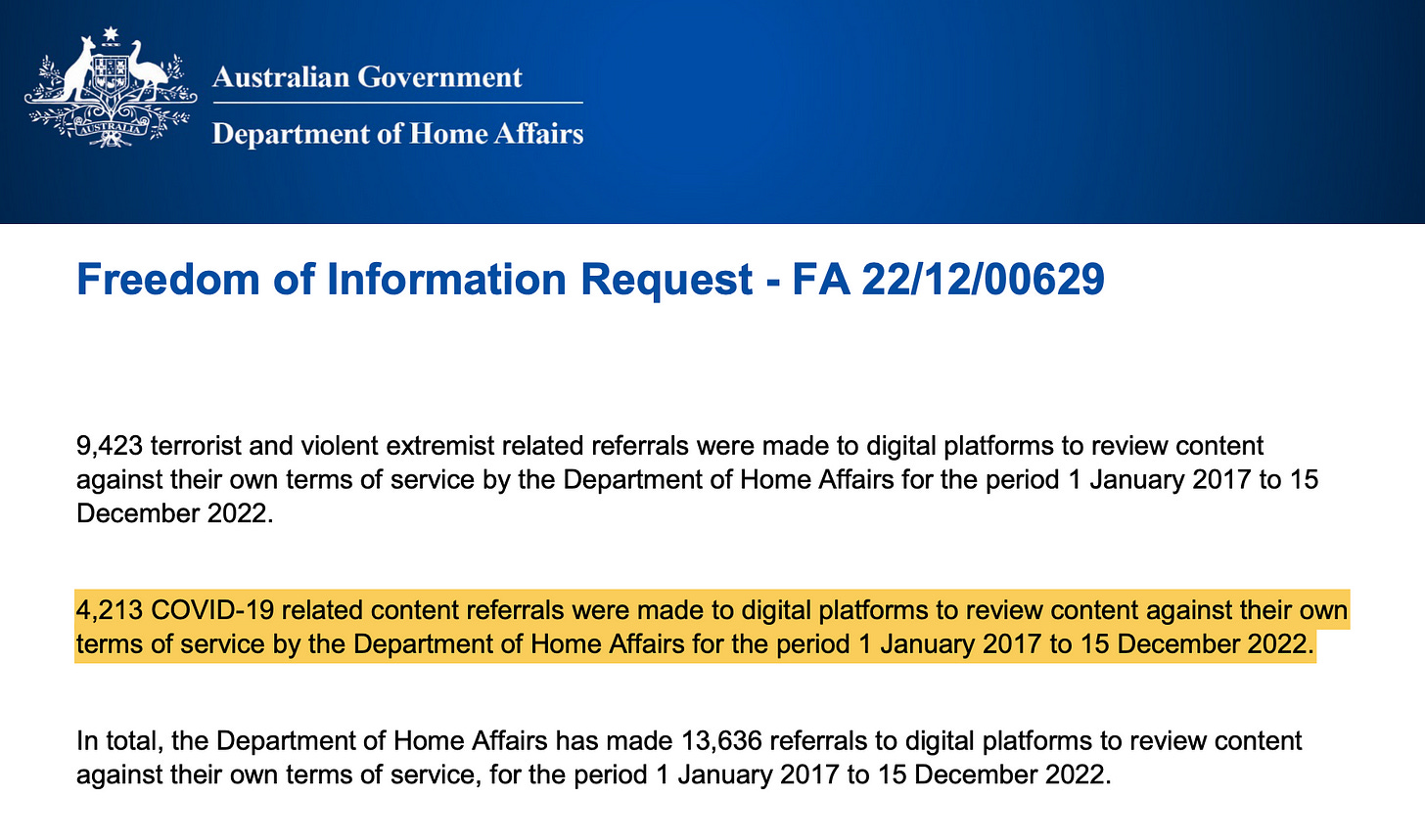 As originally published on Dystopian Down Under Substack A Freedom of Information request by Senator Alex Antic has revealed that the Australian Department of Home Affairs made over 4,000 requests to digital platforms to take down content related to Covid. The FOI documents 1 show that from the start of the pandemic up to 15 […]