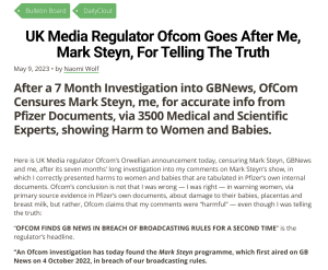 After a 7 Month Investigation into GBNews, OfCom Censures Mark Steyn, me, for accurate info from Pfizer Documents, via 3500 Medical and Scientific Experts, showing Harm to Women and Babies.   Here is UK Media regulator Ofcom’s Orwellian announcement today, censuring Mark Steyn, GBNews and me, after its seven months’ long investigation into my comments […]