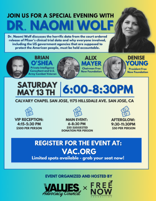 EVENT: Join Us For A Special Evening With Dr. Naomi Wolf   Saturday, May 13th 6:00 – 8:30 PM PST Calvary Chapel San Jose, 1175 Hillsdale Ave. San Jose, CA Dr. Wolf will discuss the horrific data from the court-ordered release of Pfizer’s clinical trial and why everyone involved, including the US government agencies that […]