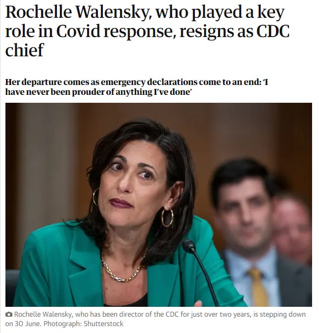 Daily Clout by Dr. Naomi Wolf - May 8th 2023 12:05pm EDT Her departure “has all the hallmarks of her getting pushed very abruptly and aggressively out the door.” On Friday (May 5), Dr. Rochelle Walensky, the Director of the Centers for Disease Control and Prevention (CDC), announced her resignation — effective June 30. Dr. Walensky’s departure, we are told by the mainstream media, comes “at a […]