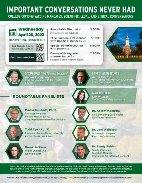 Hanover, NH –Concerned Alumni of Dartmouth College is proud to announce that environmental and public health lawyer Robert Kennedy, Jr. will be our special guest and at “College Covid-19 Vaccine Mandates – Scientific, Ethical, and Legal Consideration: A Roundtable Discussion and Dinner Event” taking place on April 26 at 3:30PM at Dartmouth College’s Hanover […]