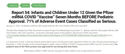 Daily Clout by Dr. Naomi Wolf - Feb 15th 2023 4:38pm EST “It almost sounds like human experimentation on babies for money.” The latest revelation that’s truly disturbing comes from the DailyClout / War Room volunteers in Pfizer Report 54. The core of the subject matter: child experimentation — with long-lasting adverse effects. Report 54: “Infants and Children Under 12 Given the Pfizer mRNA COVID ‘Vaccine’ Seven […]