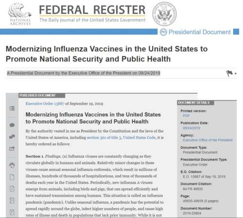 Daily Clout by Dr. Naomi Wolf - Feb 22nd 2023 3:32pm EST A Presidential Document by the Executive Office of the President on 09/24/2019 https://www.federalregister.gov/documents/2019/09/24/2019-20804/modernizing-influenza-vaccines-in-the-united-states-to-promote-national-security-and-public-health By the authority vested in me as President by the Constitution and the laws of the United States of America, including section 301 of title 3, United States Code, it is hereby ordered as follows: Section 1. Findings. (a) Influenza viruses are constantly changing as they […]