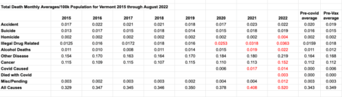 Vermont Deaths: COVID Vaccines and Boosters Appear to Be Contributing to a Significant Rise in All-Causes, Alcohol, Drug Abuse, Cancer, Homicide, Other-Disease, and Even COVID Deaths