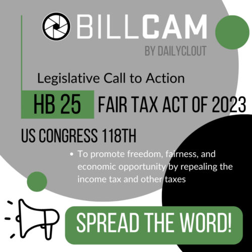 Daily Clout by Dr. Naomi Wolf - Jan 18th 2023 12:58pm EST HB 25 FairTax Act of 2023 US Congress 118th Congress About HB 25 To promote freedom, fairness, and economic opportunity by repealing the income tax and other taxes, abolishing the Internal Revenue Service, and enacting a national sales tax to be administered primarily by the States. […]
