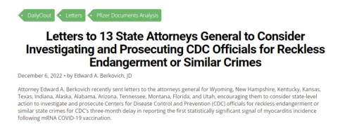 Daily Clout by Dr. Naomi Wolf - Dec 6th 2022 2:18pm ESTAttorney Edward A. Berkovich recently sent letters to the attorneys general for Wyoming, New Hampshire, Kentucky, Kansas, Texas, Indiana, Alaska, Alabama, Arizona, Tennessee, Montana, Florida, and Utah, encouraging them to consider state-level action to investigate and prosecute Centers for Disease Control and Prevention (CDC) officials for reckless endangerment or similar state crimes for CDC’s three-month […]