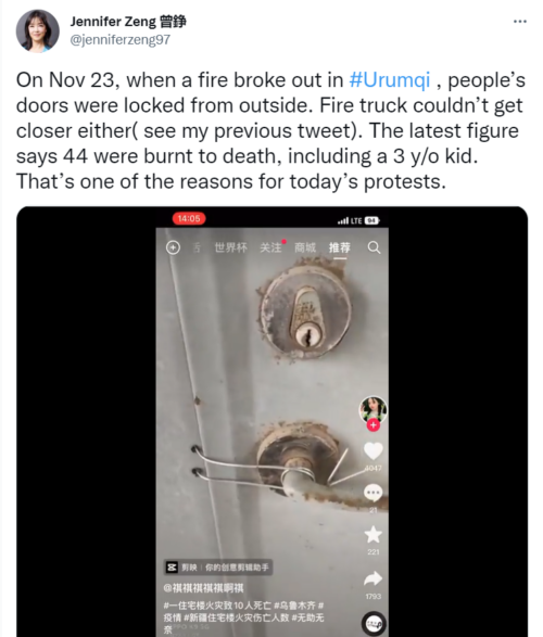 Daily Clout by Dr. Naomi Wolf - Dec 5th 2022 2:00pm EST On November 23rd a fire broke out in Urumqi’s Jixiang Yuan district in an apartment complex. Because of the Chinese COVID lockdown, it is claimed the doors to the building were locked from the outside; people could not escape. Jennifer Zeng has been documenting the story on Twitter. Fire trucks were not permitted to get close enough to […]