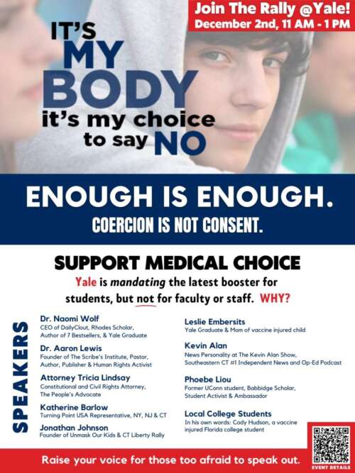 Daily Clout by Dr. Naomi Wolf - Dec 1st 2022 3:55pm EST Yale University mandated the latest booster for students, but NOT for faculty/staff. WHY? Students are not lab rats! Stand Up & Say No More! About this event Join us at this peaceful rally to learn about proper informed consent, to support medical choice and to understand your rights! The VAST majority of Yale college students were coerced […]