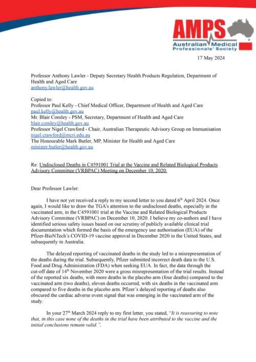 Daily Clout by Dr. Naomi Wolf - May 17th 2024 4:23pm EDT Following up on her unanswered April 6, 2024, letter to Professor Tony Lawler, Deputy Secretary of Australia’s Therapeutic Goods Administration (TGA), Dr. Jeyanthi Kunadhasan, an anaesthetist and perioperative physician in Australia and Treasurer of the Australian Medical Professionals’ Society, wrote to him again on May 17, 2024. She again expressed concern about the vaccinated deaths […]