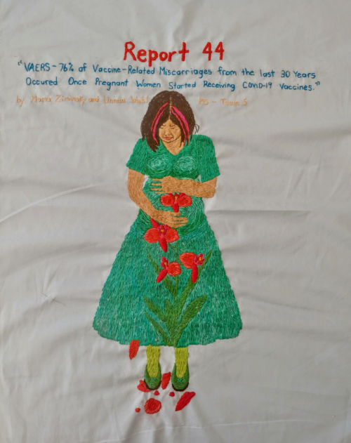 Artist Rebecca Soudant Embroidered Arresting Image Representing Pfizer Report 44, “VAERS – 76% of Vaccine-Related Miscarriages from the Past 30 Years Occurred Once Pregnant Women Started Receiving COVID-19 Vaccines.”
