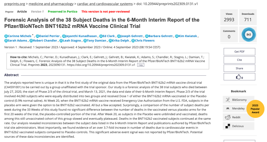 Daily Clout by Dr. Naomi Wolf - Sep 5th 2023 11:49am EDT War Room/DailyClout Pfizer Documents Analysis team members Corinne Michels, PhD; Daniel Perrier, Jeyanthi Kunadhasan, MD; Ed Clark, MSE; Joseph Gehrett, MD; Barbara Gehrett, MD; Kim Kwiatek, MD; Sarah Adams , Robert Chandler, MD; Leah Stagno, Tony Damian , Erika Delph, and Chris Flowers, MD have published a bombshell study titled, “Forensic Analysis of the 38 […]