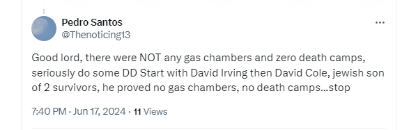 David Cole - Jun 18th 2024 1:00pm EDT One of the sadder aspects of being banned from Twitter is that I can’t ridicule Holocaust deniers who post shit like this: Deniers just love pulling nonsense outta their asses. I’ve written at length about my parents and I’ve never said that even ONE of them was a “survivor” (my mom lived in Brooklyn during […]