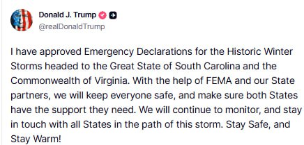 Disclose TV - Jan 24th 2026 10:16am EST JUST IN – Trump says he has “approved Emergency Declarations for the Historic Winter Storms headed to the Great State of South Carolina and the Commonwealth of Virginia.” @disclosetv
