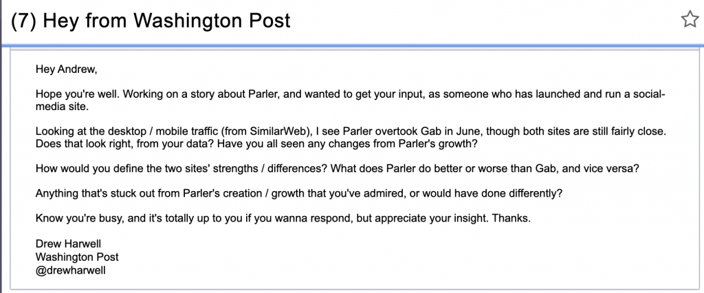 - Nov 19th 2020 9:39am EST The following is my email exchange with the Jeff Bezos Amazon Washington Post in full: Hey Andrew,Hope you’re well. Working on a story about Parler, and wanted to get your input, as someone who has launched and run a social-media site. Looking at the desktop / mobile traffic (from SimilarWeb), I see Parler overtook Gab in June, […]