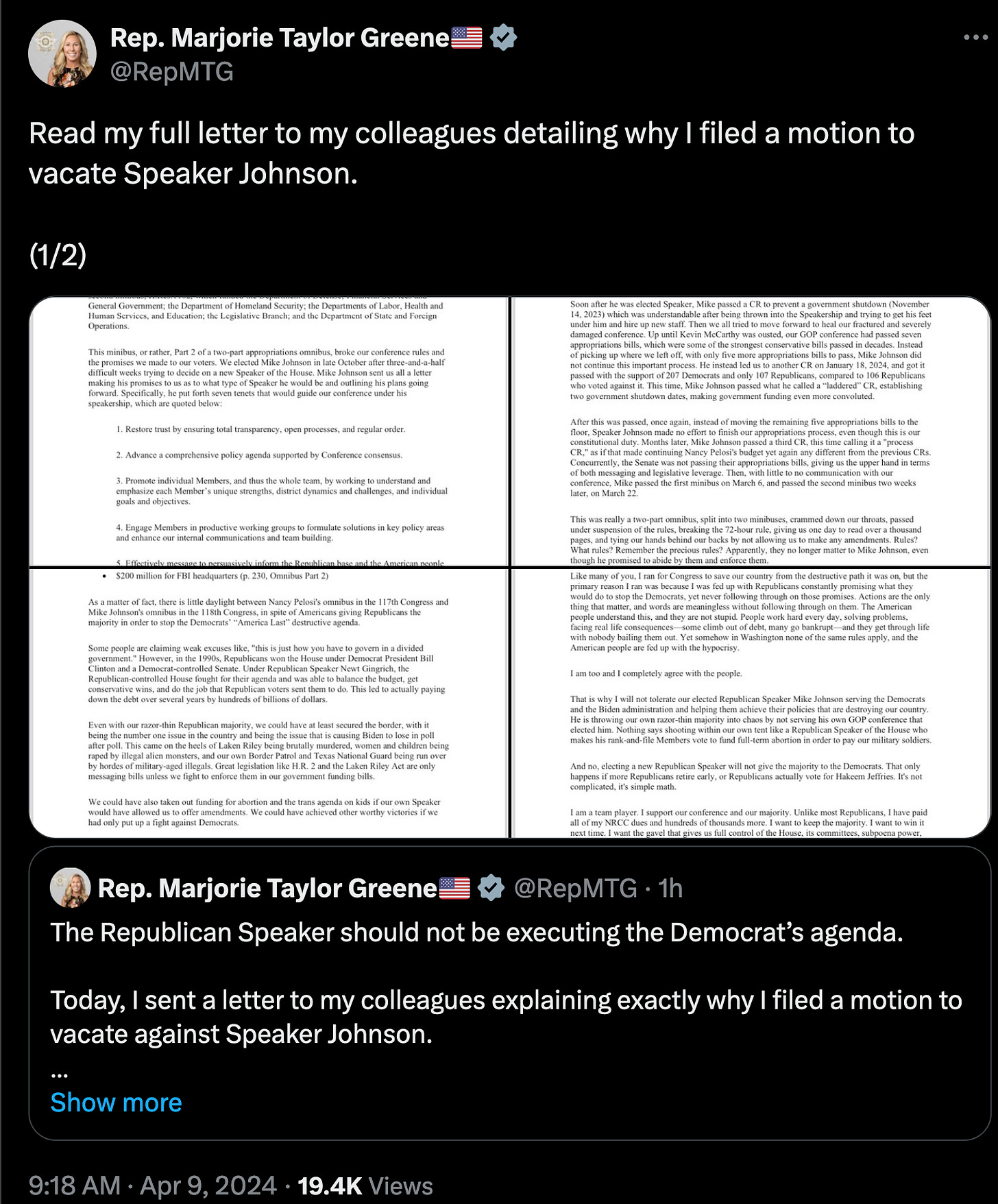 The Right Way is the #1 conservative blog on Substack — recommended by over 260 other Substack authors! Subscribe now Marjorie Taylor Greeen’s April 9th filing of a motion to vacate the chair — a dagger aimed at fledgling Speaker Mike Johnson only five months after he assumed control — should not have surprised anyone […]