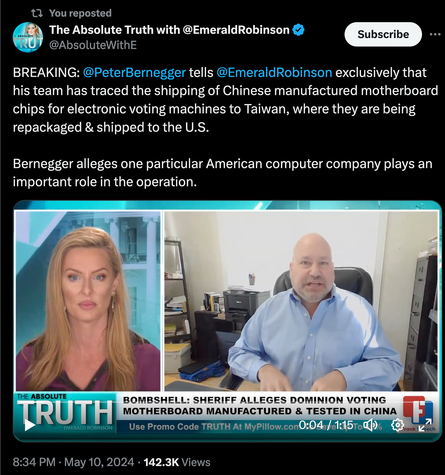 The Right Way is the #1 conservative blog on Substack — recommended by over 264 other Substack authors! Get 20% off for 1 year Citizen investigator Peter Bernegger broke an exclusive on my TV show “The Absolute Truth” that his team has traced the shipping of Chinese-manufactured motherboard chips for electronic voting machines to Taiwan, […]