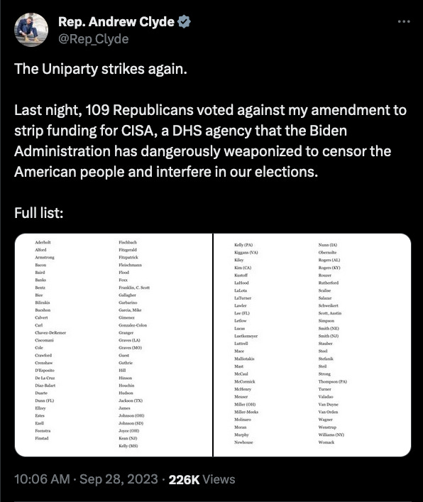 The Right Way is the #1 conservative blog on Substack — recommended by over 220 other Substack authors! Get 20% off for 1 year Two days ago, 109 Republican representatives voted against an amendment by Rep. Andrew Clyde (R) to strip funding for CISA — the notorious “cybersecurity” agency (inside the much larger Department of […]