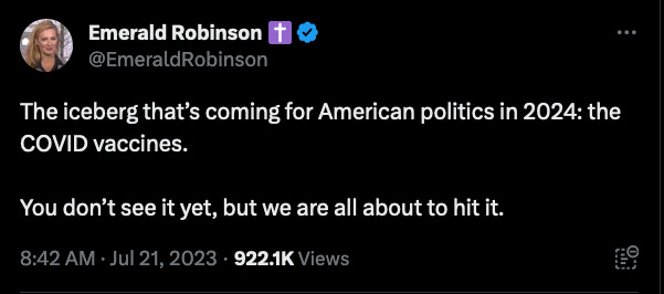 Emerald Robinson - Aug 11th 2023 8:34am EDT The Right Way is the #1 conservative blog on Substack — recommended by over 207 other Substack authors. Get 20% off for 1 year There’s a hidden iceberg that America has already hit, and that iceberg is “Operation Warp Speed.” People are dying in far greater numbers now than before the COVID vaccines — for […]