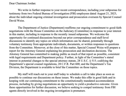 Emerald Robinson - Aug 31st 2023 9:58am EDT The Right Way is the #1 conservative blog on Substack — recommended by over 210 other Substack authors! Get 20% off for 1 year The Biden Regime’s Department of Justice recently sent a letter to Rep. Jim Jordan, the Chairman of the House Judiciary Committee, after Congress sent the DOJ two subpoenas for testimony from […]