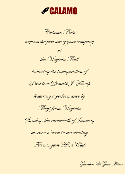 Emerald Robinson - Jan 15th 2025 4:28pm EST I’ve joined forces with my book publisher, Calamo Press, for a very special inaugural ball — the Virginia Ball — on Sunday, January 19th at the historic Farmington Hunt Club near Charlottesville, Virginia. Why Charlottesville? Because it’s beautiful horse country and it’s only a hop, skip and a jump from the homes of three of […]