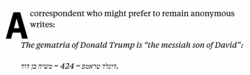 Henry Makow - Jun 21st 2025 3:02pm EDT Is Donald Trump the Antichrist? https://theofficialurban.substack.com/p/is-donald-trump-the-anti-christ “Gematria is a Kabbalistic method of interpreting the Hebrew scriptures by computing the numerical value of words, based on those of their constituent letters.” The letters in Trump’s name add up to 424, which is the same total as the letters in the Hebrew word for Messiah. This ups […]